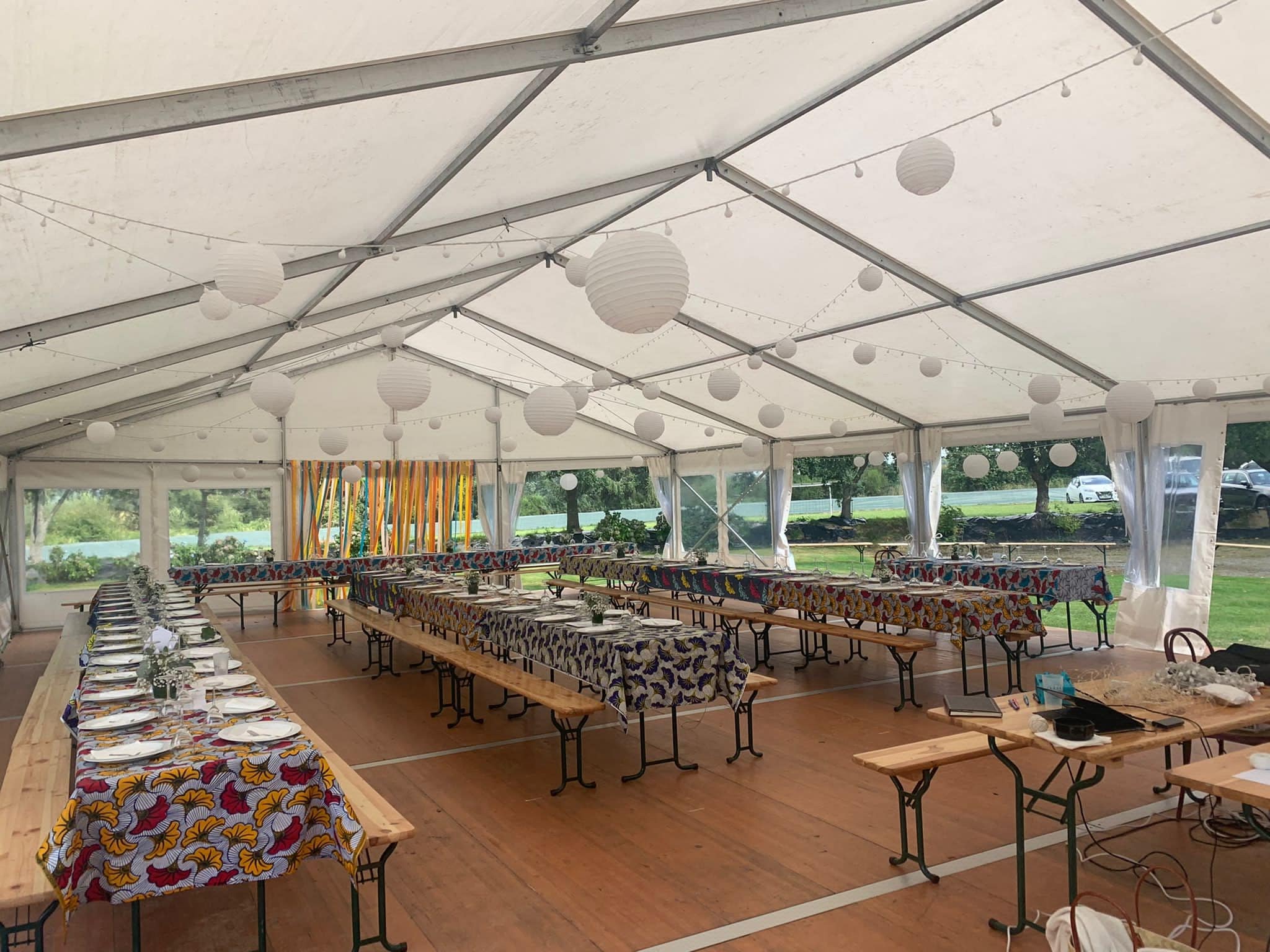 Tentes, planchers, tables, chaises, vaisselle, sonorisation, éclairage, chauffage…